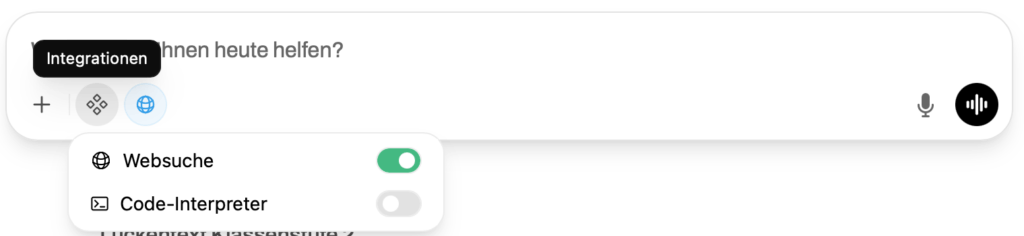 Nicht immer verfügt die KI aus sich heraus über aktuelles Wissen – besonders bei sehr neuen Ereignissen oder tagesaktuellen Fakten. Hier kommt die Websuche ins Spiel. Die eduinfra KI bietet die Möglichkeit, eine Live-Websuche einzubinden, sodass das KI-Modell aktuelle Informationen aus dem Internet abrufen kann. Um die Websuche zu aktivieren, klicke auf das „Integrationen“-Symbol unter dem Chat-Eingabefeld (neben dem „+“-Symbol). In dem daraufhin erscheinenden Menü findest Du eine Option „Websuche“ mit einen kleinen Umschalter, den Du auf “An“ stellen kannst. Ist die Websuche eingeschaltet, wird der KI bei der nächsten Anfrage erlaubt, im Hintergrund Online-Recherchen durchzuführen.
